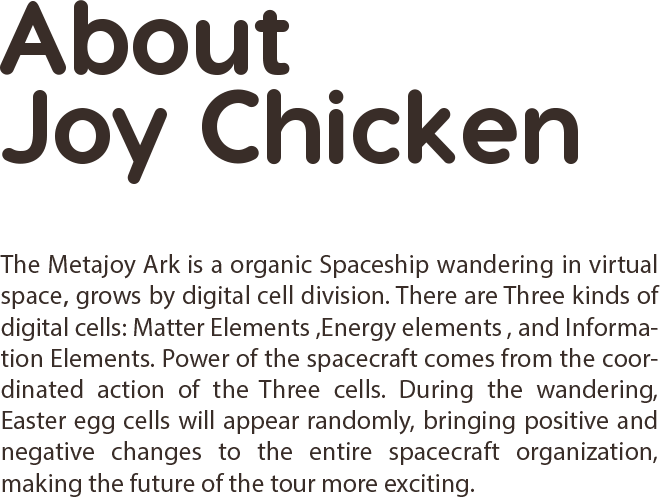 Joy Chickens are a collection of 10,000 NFTs (non-fungible tokens) made up of hundreds of exciting visual traits hand-drawn by famous artists. Owning a Joy Chicken NFT gives you a boarding pass (aka. membership access) to the Metajoy Ark.